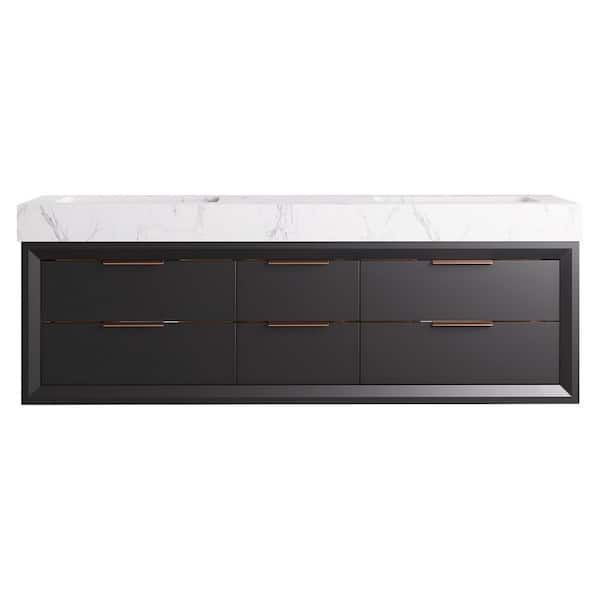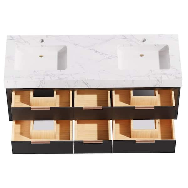MarbleLux 60 in. W x 20.8 in. D x 21.2 in. H Wall Mounted Bathroom Vanity with Double Sink in Black with Marble Top
