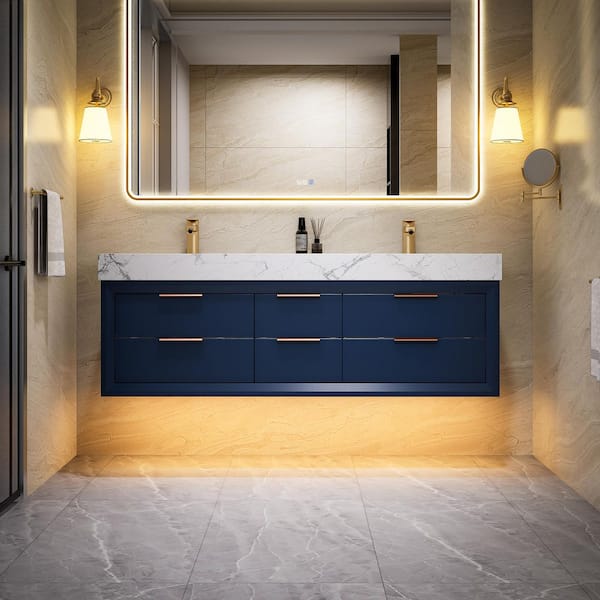 MarbleLux 60 in. W x 20.8 in. D x 21.2 in. H Wall Mounted Bathroom Vanity with Double Sink in Blue with White Marble Top