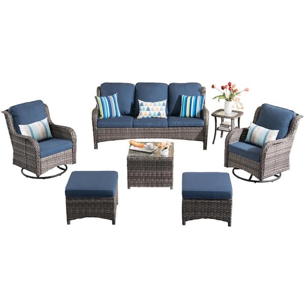 Maroon Lake Gray 7-Piece Wicker Patio Conversation Seating Sofa Set with Denim Blue Cushions and Swivel Rocking Chairs