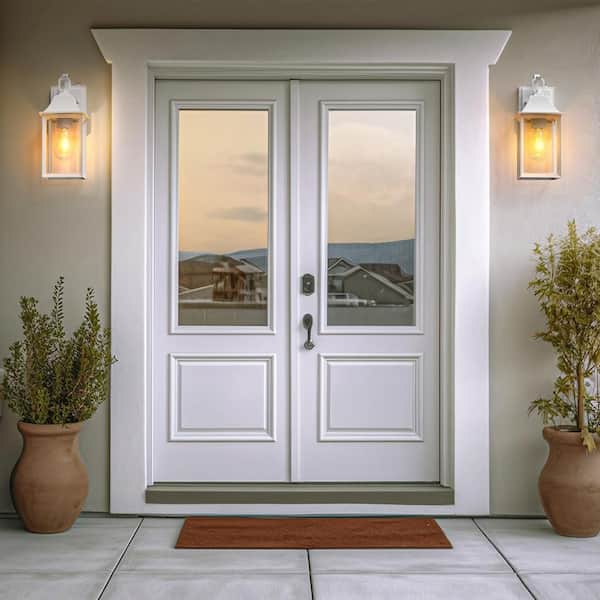 Decorators 14 in. E26 White Farmhouse Cylinder Dusk to Dawn Outdoor Hardwired Cylinder Glass Sconce