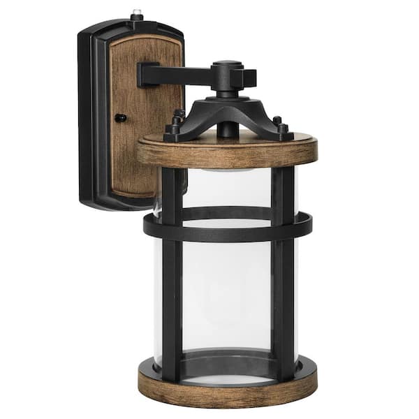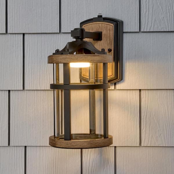 Black Outdoor LED Wall Light with /Wood Grain Finish, Sconce, Clear Glass, Dusk to Dawn Sensor, 800 Lumens, 3000K