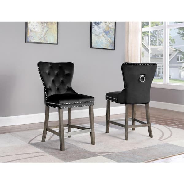 Maya 24 in. H Black Velvet Full Back Counter Height Chair With Wood Legs, Nail Head Trim and Back Ring (Set of 2)