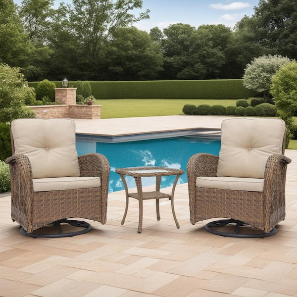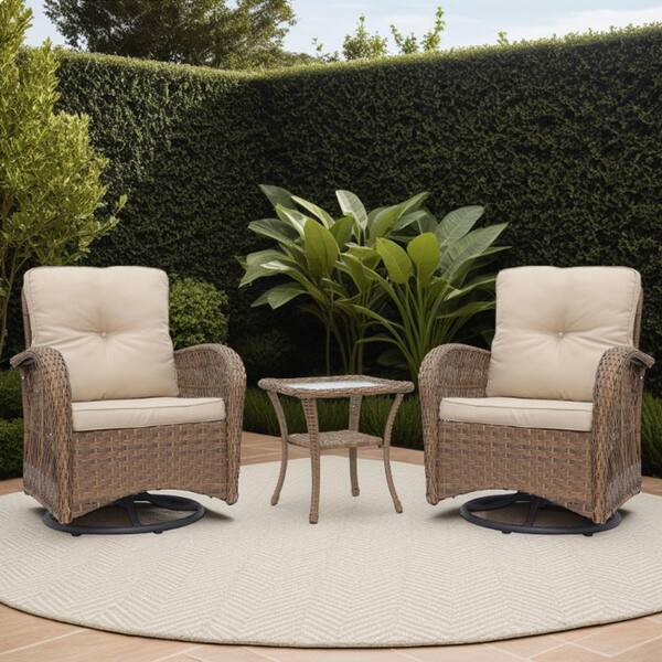 3-Piece Wicker Outdoor Conversation Chat Set Seating Group W/ Swivel and Glider Chairs, Glass Top Side Table,Light Brown