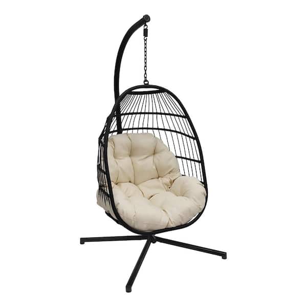 32.5 in. 1-Person Black Steel Stand and Wicker Hanging Basket Patio Swing Chair with Beige Cushion