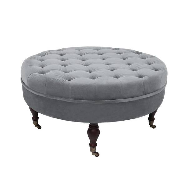 33 in. Light Grey Velvet Fabric Upholstered Tufted Round Cocktail Ottoman with Casters