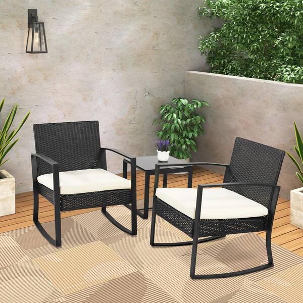 Black 3-Piece Wicker Rocker Patio Conversation Set with Beige Cushions