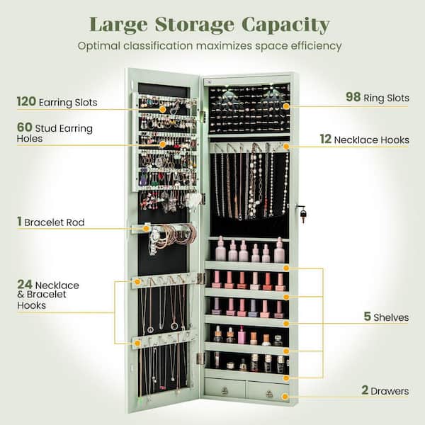 14 in. x 47.5 in. Green Wall Mounted Lockable MDF Jewelry Armoire Organizer Cabinet Box with Mirror and Drawers