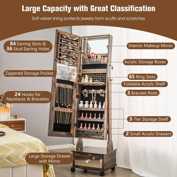 16.5 in. x 62.5 in. Rustic Brown Freestanding Lockable Mirrored MDF Jewelry Boxes Armoire with Lights and Drawer