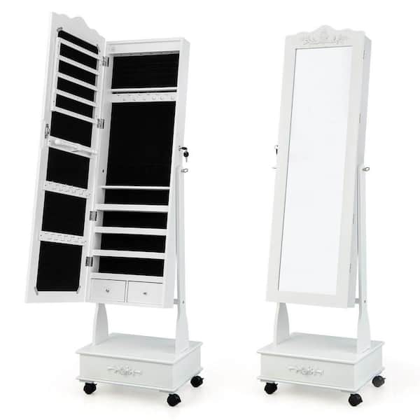 White Rolling Floor Standing Mirrored Jewelry Armoire with LED Lights and Drawers