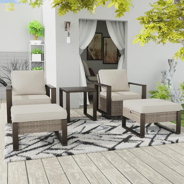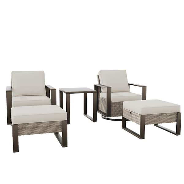 5-Piece Swivel Rocker Wicker Outdoor Patio Conversation Set with Beige Cushions