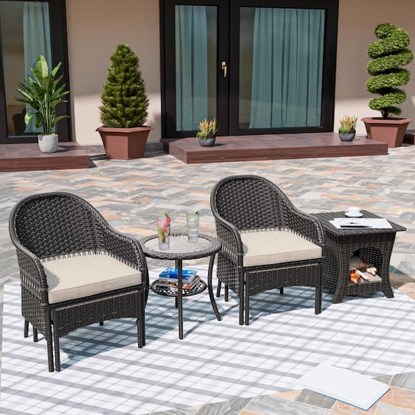6-Piece Outdoor Wicker Patio Conversation Seating Set with Beige Cushions and Pet Side Table
