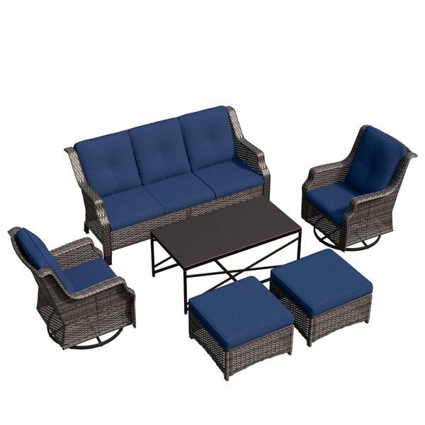 6-Piece Patio Furniture Swivel Chairs Outdoor Wicker Patio Conversation Set with Blue Cushions