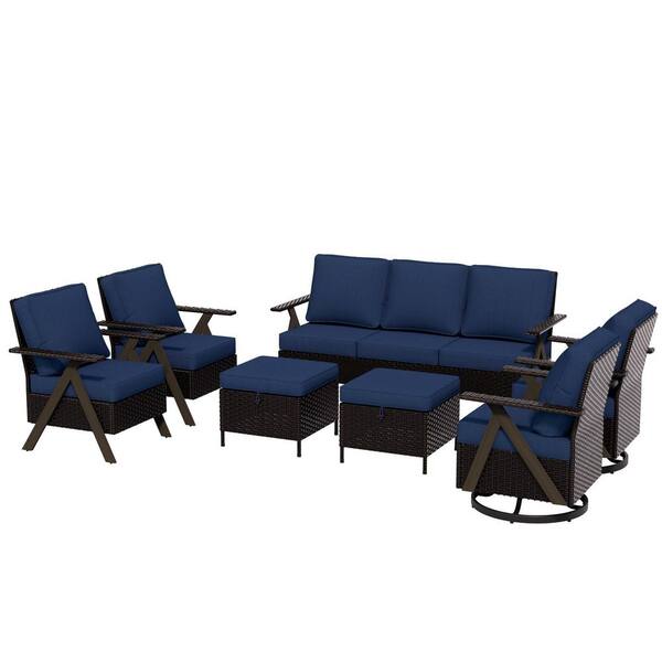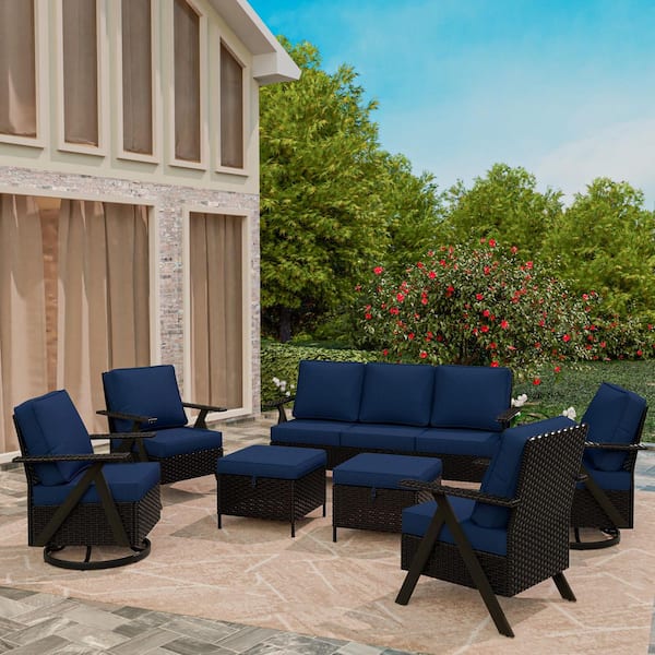 7-Piece Brown Rattan Outdoor Wicker Patio Conversation Set with Blue Cushions
