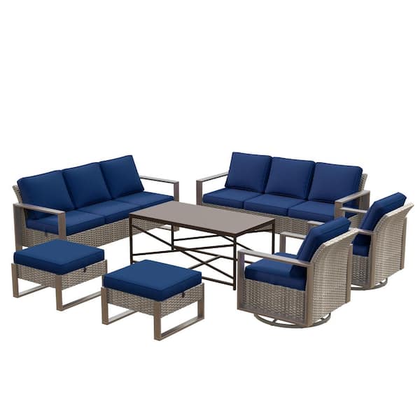 7-Piece Wicker Outdoor Patio Conversation Set with Blue Cushions and Coffee Table