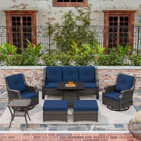 7-Piece Wicker Outdoor Patio Fire Pit Seating Sofa Set with Blue Cushions