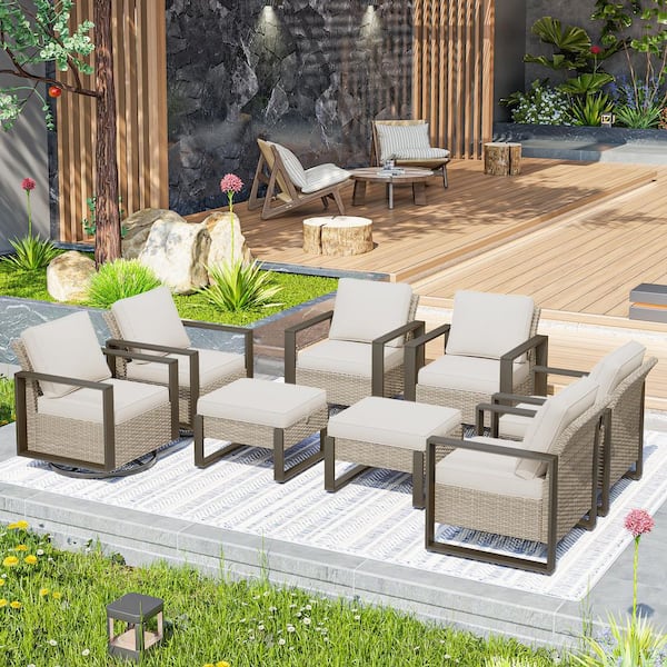 8-Piece Brown Rattan Wicker Outdoor Patio Conversation Set with Beige Cushions and Rocking Chairs