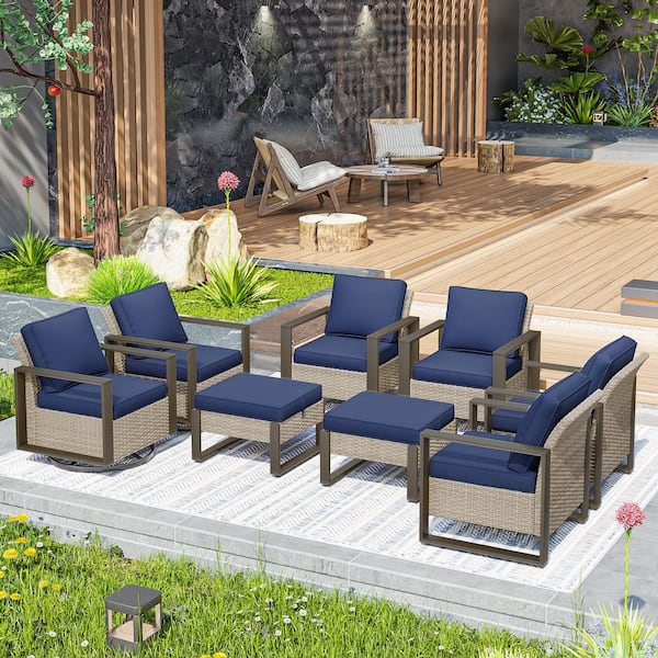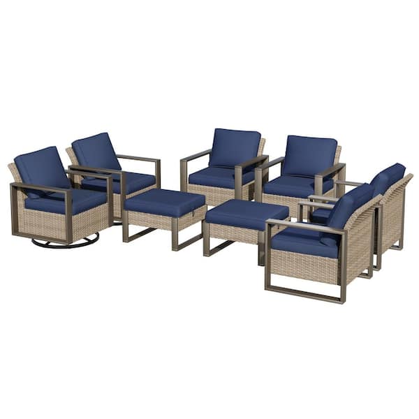 8-Piece Brown Rattan Wicker Outdoor Patio Conversation Set with Blue Cushions and Rocking Chairs