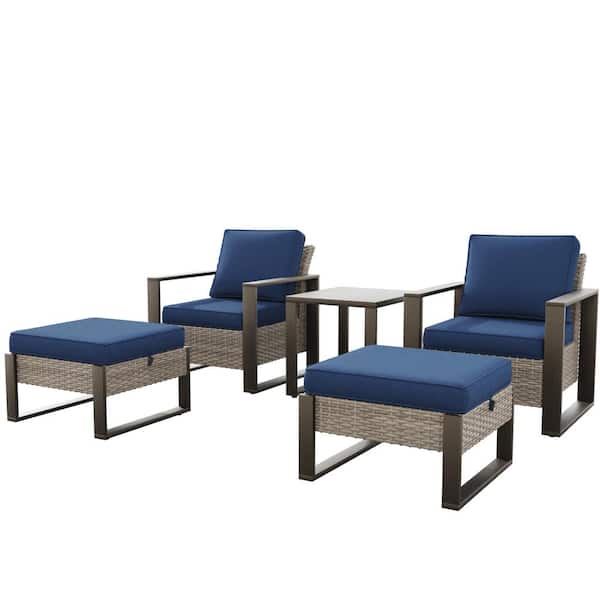 Brown 5-Piece Wicker Outdoor Patio Conversation Set Rectangular Frame with 4 in. Thick Blue Cushions and Table, Ottomans