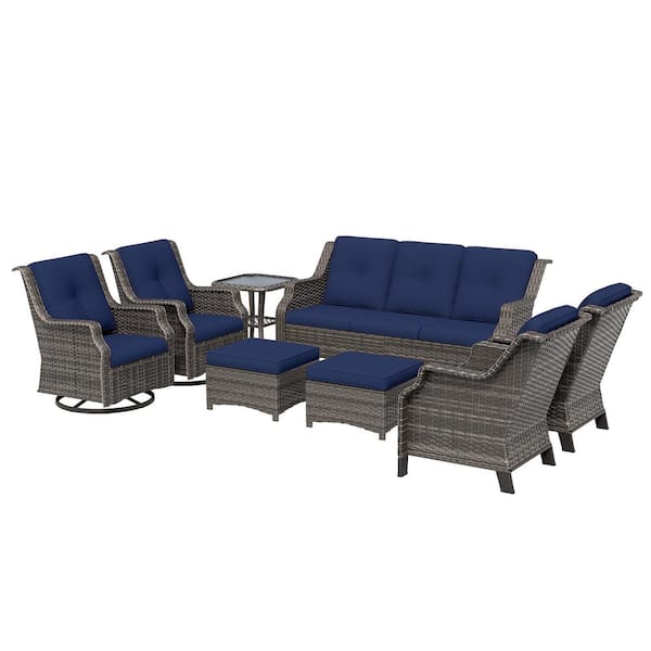 Outdoor Patio Furniture Set 8-Piece Wicker Patio Conversation Seating with Blue Cushion