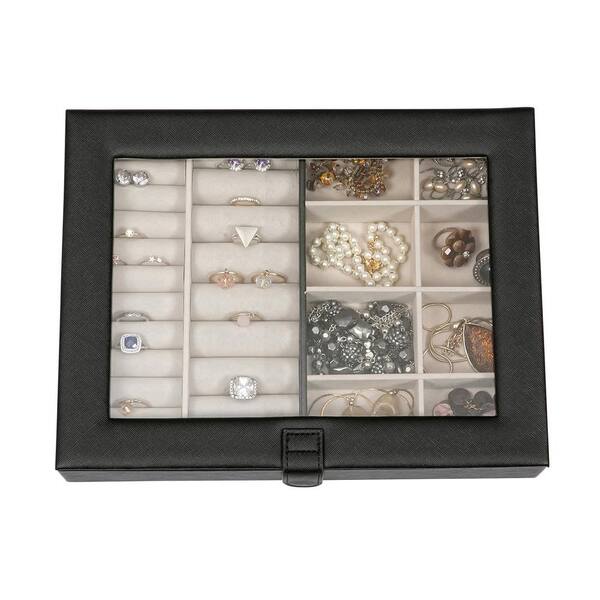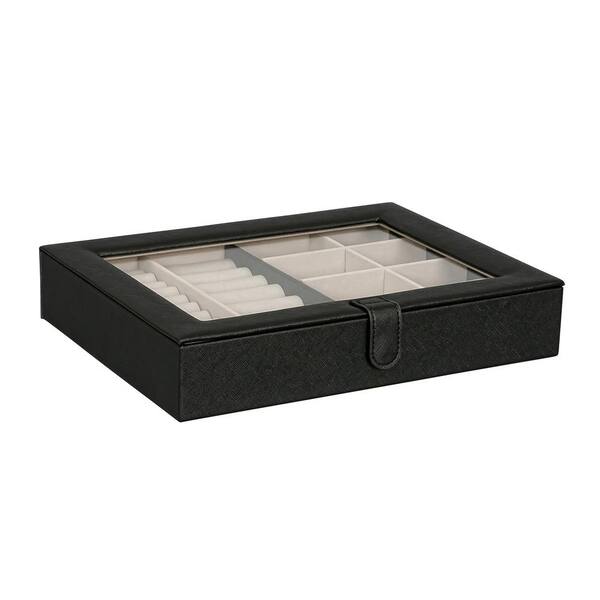 Crystal Glass Top Fashion Jewelry Box in Textured Black Faux Leather