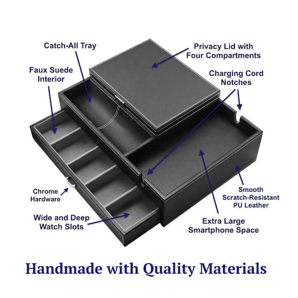 Men's Leather Watch Box Valet Tray, Bedside Organizer with Charging Station, Grey, 13.75 in. x 10 in. x 4.4 in.