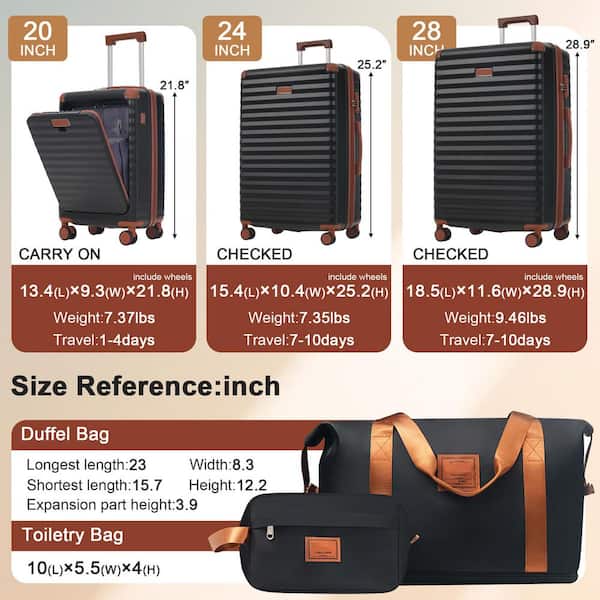5 Bags 5-Piece Black Brown Expandable ABS Hardside Luggage Set with Duffel/Toiletry Bag, USB Ports, Front Opening
