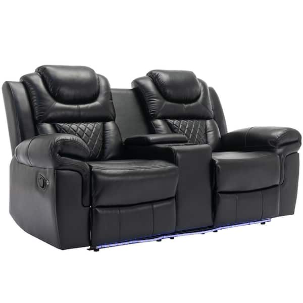 Black 73.2 in. PU Home Theater Seating Manual Recliner Loveseat with Hide-Away Storage, Cup Holders and LED Light Strip