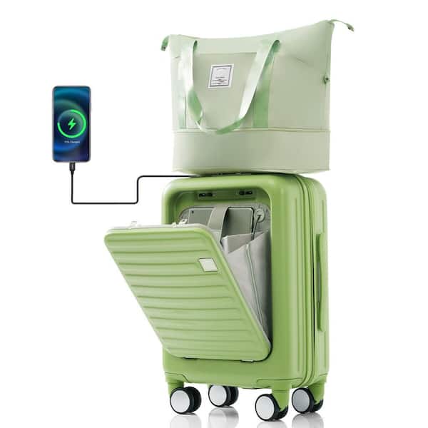 Front Opening 2-Piece Light Green 20 in. ABS Hardshell Spinner Luggage Set Expandable Travel Bag,USB Ports Cup Holder