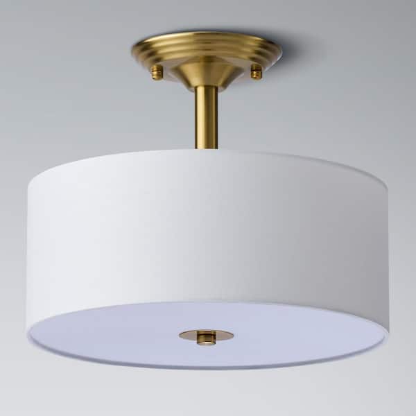 13 in. 2-Light Antique Brass Semi-Flush Mount Light with Fabric Drum Shade