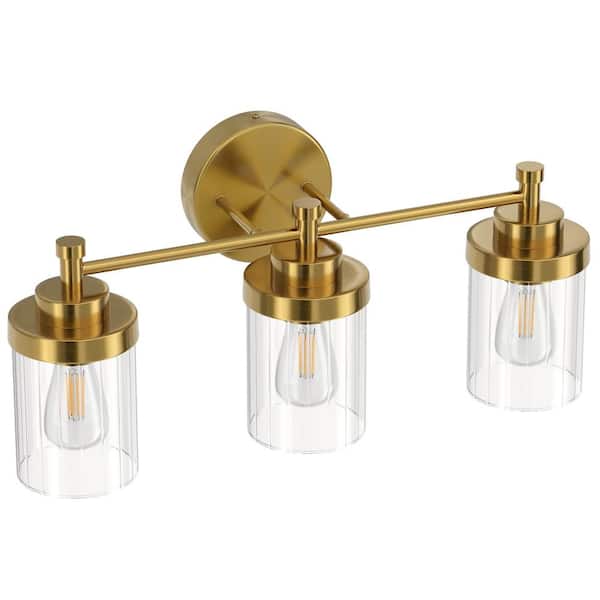 18 in. 3-Light Antique Brass Modern Dimmable Vanity Light with Clear Ribbed Glass Shades E26 Sockets