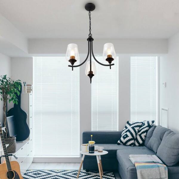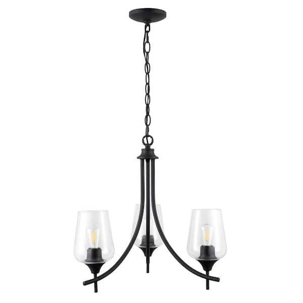 3-Light Matte Black Semi-Flush Mount Adjustable Chandelier with Glass Shade