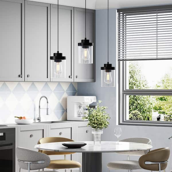 60-Watt 1-Light Matte Black Mini Pendant Light with Clear Shade and Adjustable Height, (Set of 3)