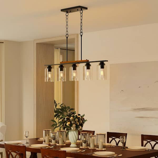 60-Watt 5 Light Matte Black Kitchen Island Linear Pendant Light Fixture with Clear Glass Shade