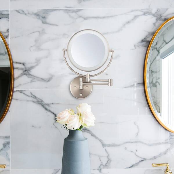 9 in. W x 15 in. H Framed 2 Sided 8x Mag Bi Fold Dimmable LED Light Makeup Mirror in Brushed Nickel