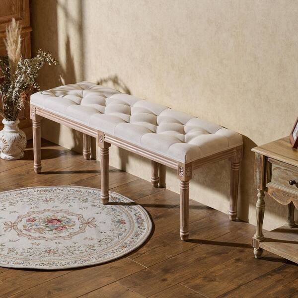 Beige French Vintage Ottoman Bench with Linen Upholstery (19 in. x 48 in. x 16.7 in.)