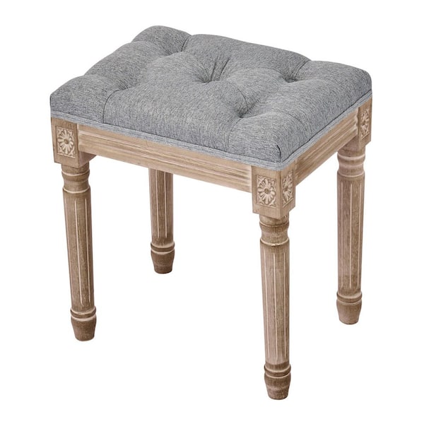 Maison De Lys 1-Piece Gray Upholstered Ottoman Vanity Stool with Button Tufting and Carved Wood Frame
