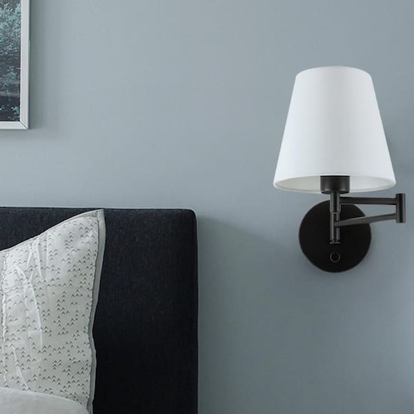 Modern 1-Light Black Swing Arm Wall Lamp with White Fabric Shade and 72" Cord for Bedroom and Foyer