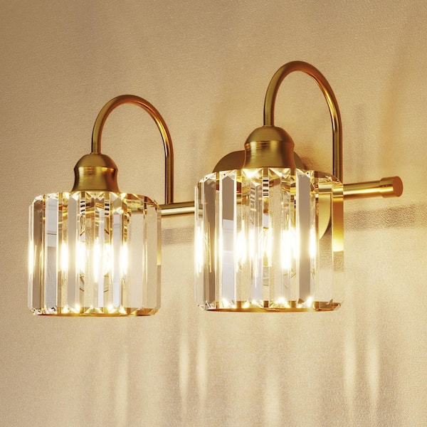 Merrin 14.3 in. 2-Light Brushed Gold Bathroom Vanity Light with Crystal Shades