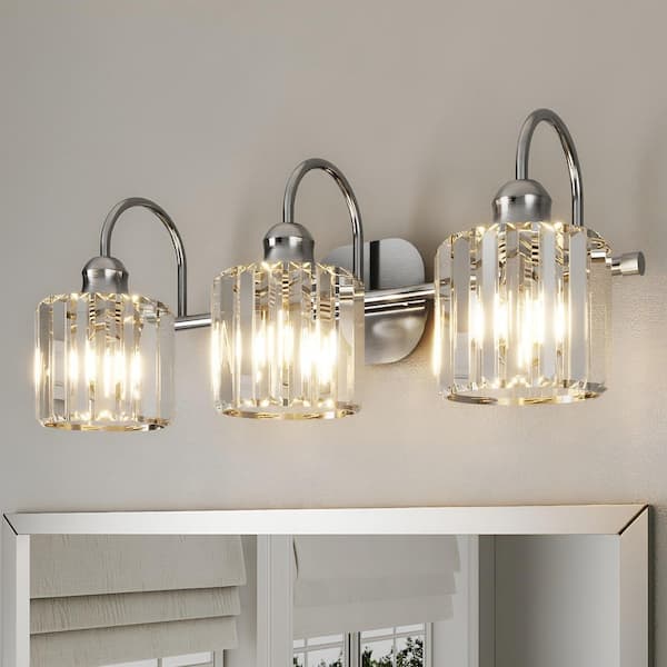 Merrin 23.1 in. 3-Light Brushed Nickel Bathroom Vanity Light with Crystal Shades