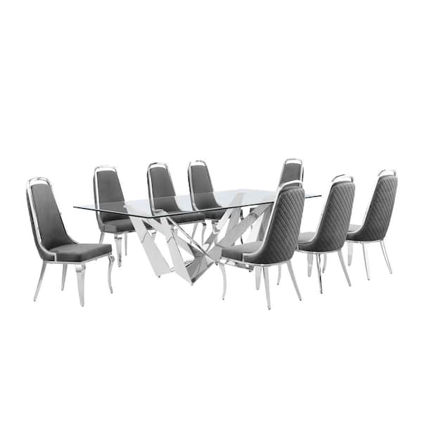 Meryl 9-Piece Rectangular Glass Top Stainless Steel Base Dining Set With 8-Dark Grey Velvet Chrome Iron Legs Chairs