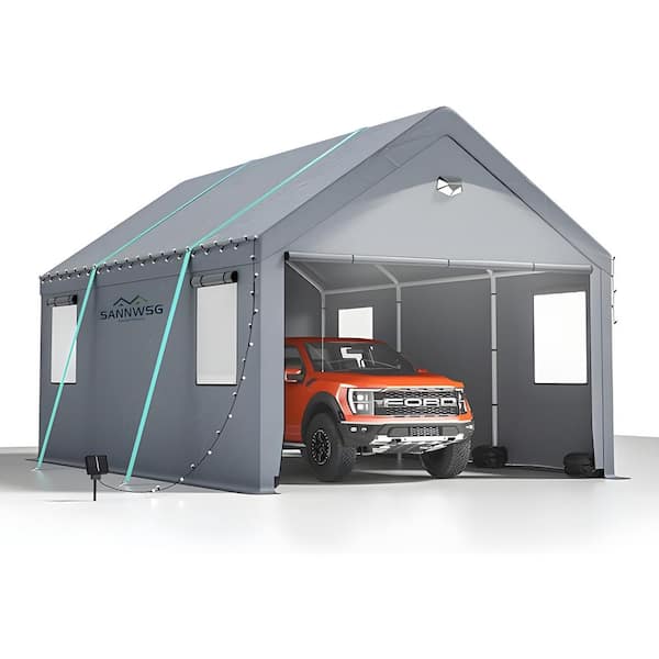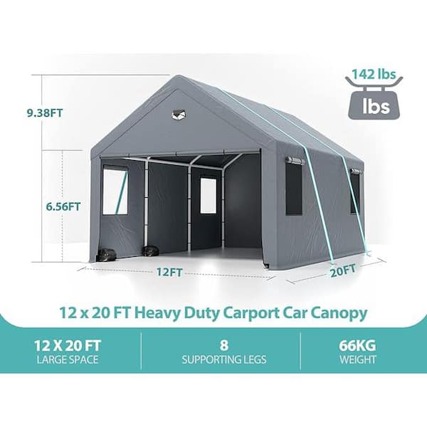 Metal 12 ft. x 20 ft. Gray Heavy Duty Carport Canopy, Waterproof Large Portable Car Tent Garage with Windows, Sidewalls