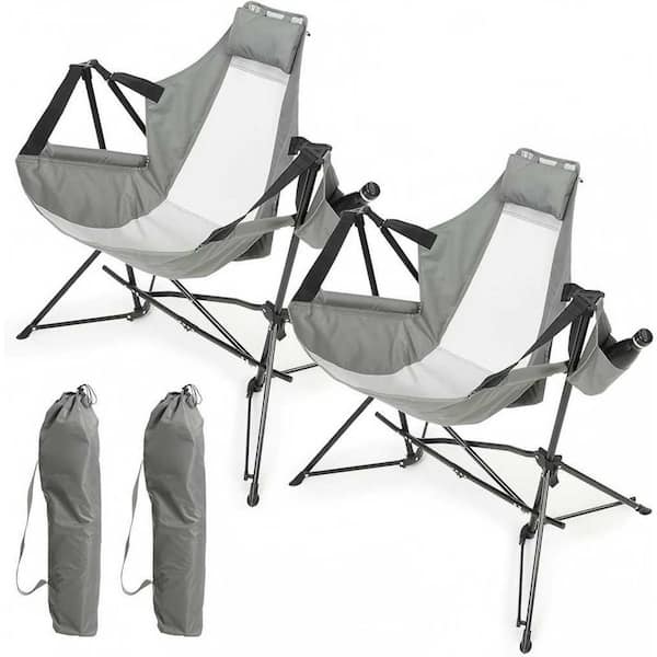 Metal Folding Adjustable Back Lawn Chair with Pillow Cup Holder and Carry Bag in Grey (2-Pieces)