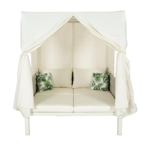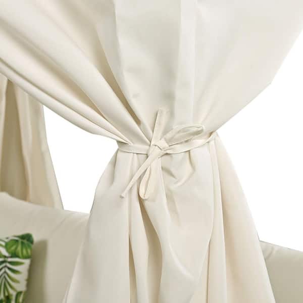 Metal Outdoor Day Bed, Canopy Bed Patio Sunbed with Curtains, Woven Rope Lounger Loveseat Sofa with Beige Cushions
