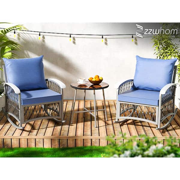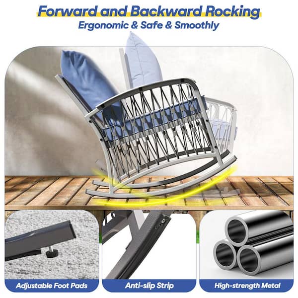 Metal Outdoor Rocking Chair with Blue Cushions and Tempered Glass Top Roped 2-Pack