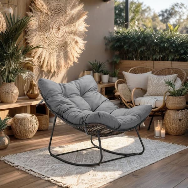 Metal Rattan Rope Club Outdoor Rocking Chair with Upholstery and Light Gray Cushion (1-Piece)