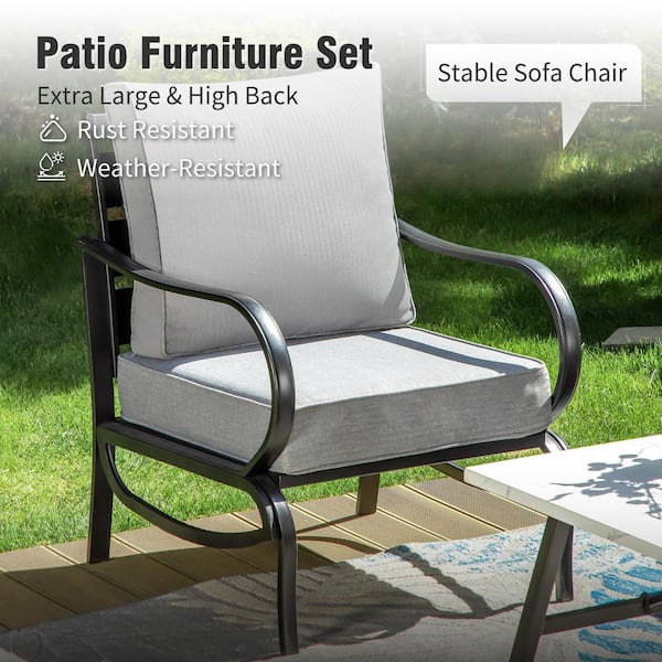 Metal Slatted 7-Seat 6-Piece Outdoor Patio Conversation Set with Gray Cushions, Table with Marble Pattern Top