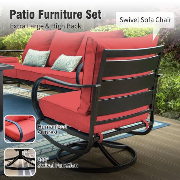 Metal Slatted 7-Seat 6-Piece Outdoor Patio Conversation Set with Red Cushions Table with Marble Pattern Top