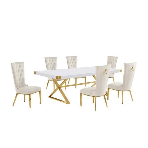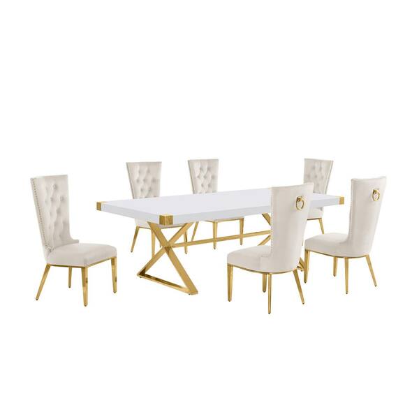 Miguel 7-Piece Rectangle White Wood Top Gold Stainless Steel Dining Set with 6 Cream Velvet Chairs