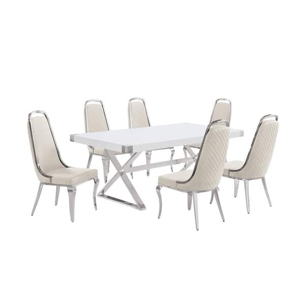 Miguel 7-Piece Rectangle White Wood Top Silver Stainless Steel Dining Set with 6-Cream Velvet Chairs.