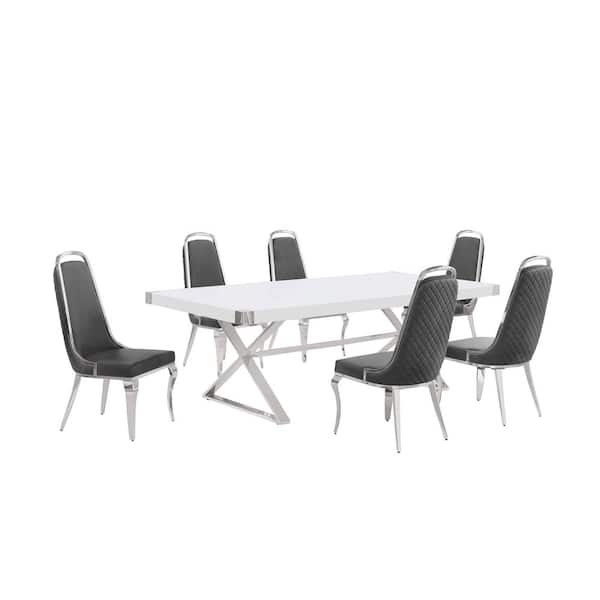 Miguel 7-Piece Rectangle White Wood Top Silver Stainless Steel Dining Set with 6 Dark Gray Chairs